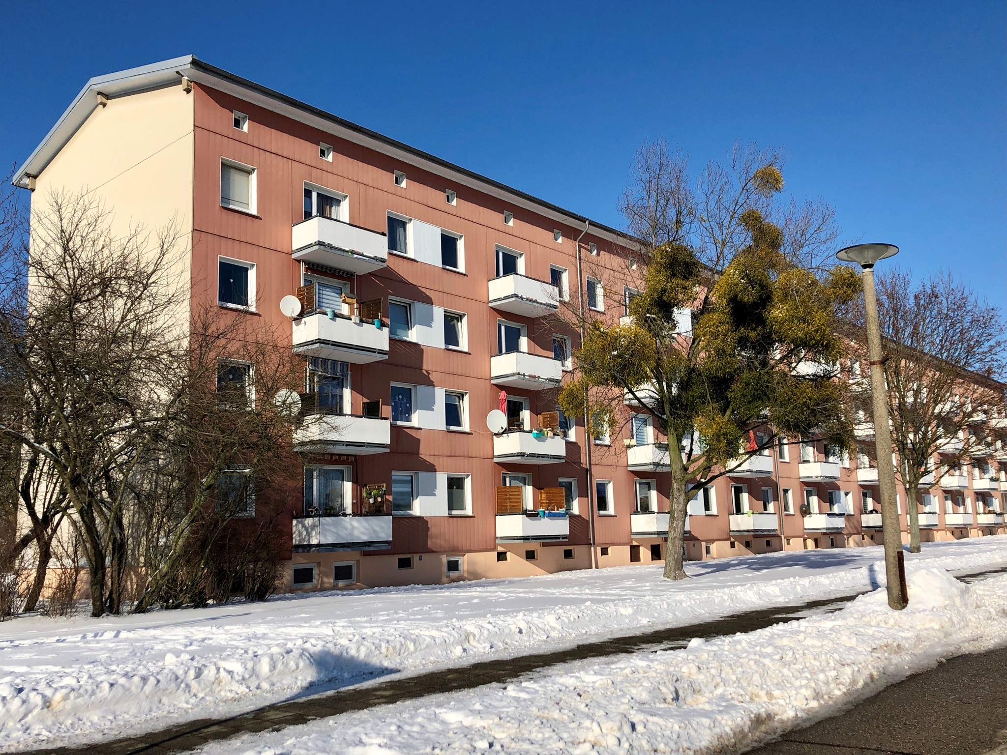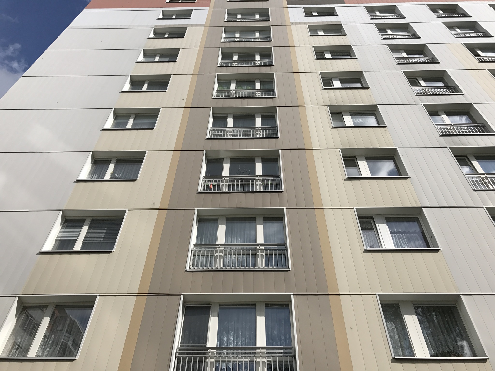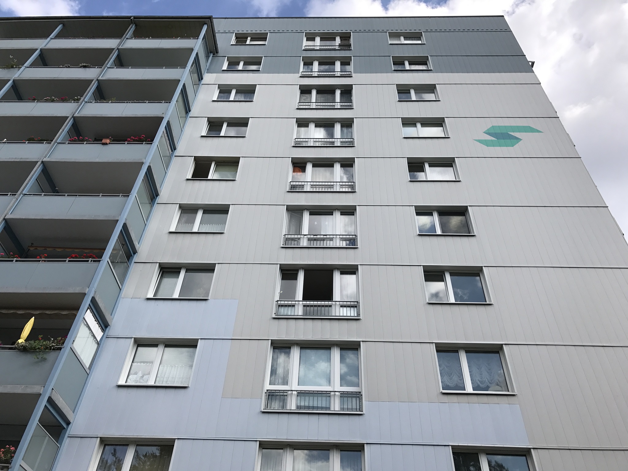 3. Die PVDF-Lackierung an der Vorderseite der Farbaluminium-Paneele hat eine „natürliche Abkreidung“. Jedes Jahr wittern wenige Bruchteile eines µ von der Oberfläche ab. Schmutz und Staub können sich daher nicht auf der Oberfläche halten - die Fassade bleibt immer sauber. Auch kann sich die Oberfläche aufgrund ihrer Konstruktionsweise nicht statisch aufladen. Schmutzpartikel haften deshalb nicht an der Fassade. Eine Lebensdauer von 50 Jahren und länger ist bei Farbaluminium-Fassaden in der Praxis vielfach nachweisbar.
