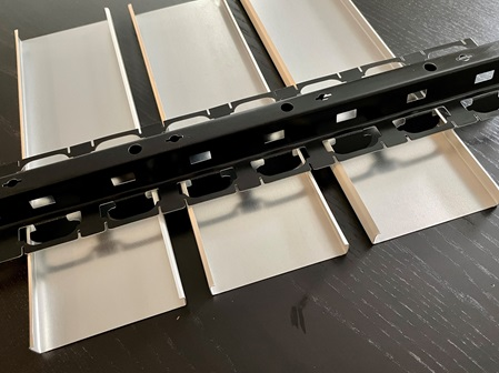 Die Leichtmetall-Paneele für die ORIGINAL DOBNER Aluminium-Paneeldecken mit offenen Fugen werden hergestellt aus gewalztem Farb-Aluminiumband. Die Legierung ist ALMn 0,5 Mg 0,5 H 44-48, verarbeitet nach EN 13523 oder hochglanzeloxiert aus AL 99,85 (hart) rollformfähig. Die Deckenpaneele werden mittels eines Rollformverfahrens profiliert. Die Farbbeschichtung wird mit hohen Temperaturen eingebrannt und somit unlösbar mit dem Aluminiumband verbunden.