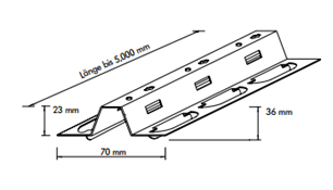 Um die Ebenheit bei der Montage sicherzustellen, sind zunächst die Randwinkel entsprechend der gewünschten Abhänge Höhe plan eben an den begrenzenden Bauteilen zu befestigen. Wandanschlüsse sind nicht belastbar. Die Nutzung als Auflage ist nicht möglich. Bei offenem Wandanschluss ist die Planebenheit durch geeignete Messpunkte sicherzustellen. Erforderliche Längszuschnitte der Paneele und Einbauten werden ausgeführt, bevor die Deckenfläche geschlossen wird. Bei Direktmontage der Tragschienen sind diese mit Spiel zu befestigen, um eine Verwindung dieser zu vermeiden und etwaigen Dehnungen entgegenzuwirken.