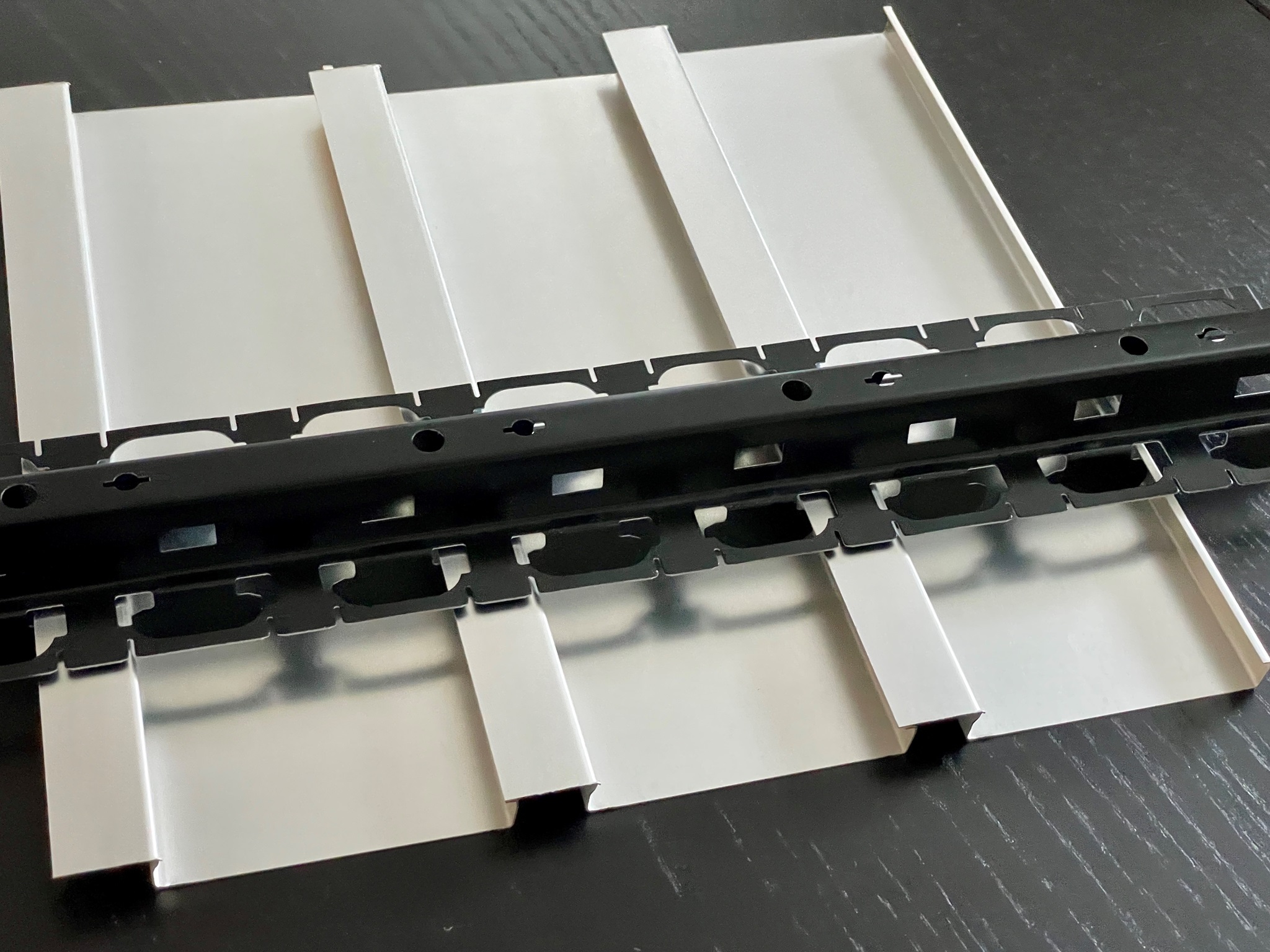 Stöße bei Metallpaneelen sind mit schwarzen Längsverbindern auszustatten. Eine geringfügig optische Beeinträchtigung der Gleichmäßigkeit des Deckenbildes im Paneelstoß ist technisch unvermeidlich.