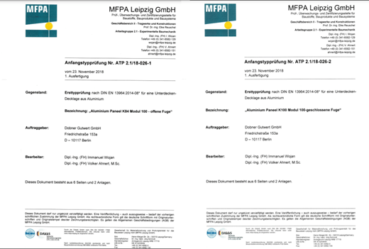 Die DOBNER GUTWERT Deckenprodukte wurden geprüft von der Gesellschaft für Materialforschung und Prüfungsanstalt für das Bauwesen Leipzig mbH (MFPA), Hans-Weigel-Str. 2 b, 04319 Leipzig.